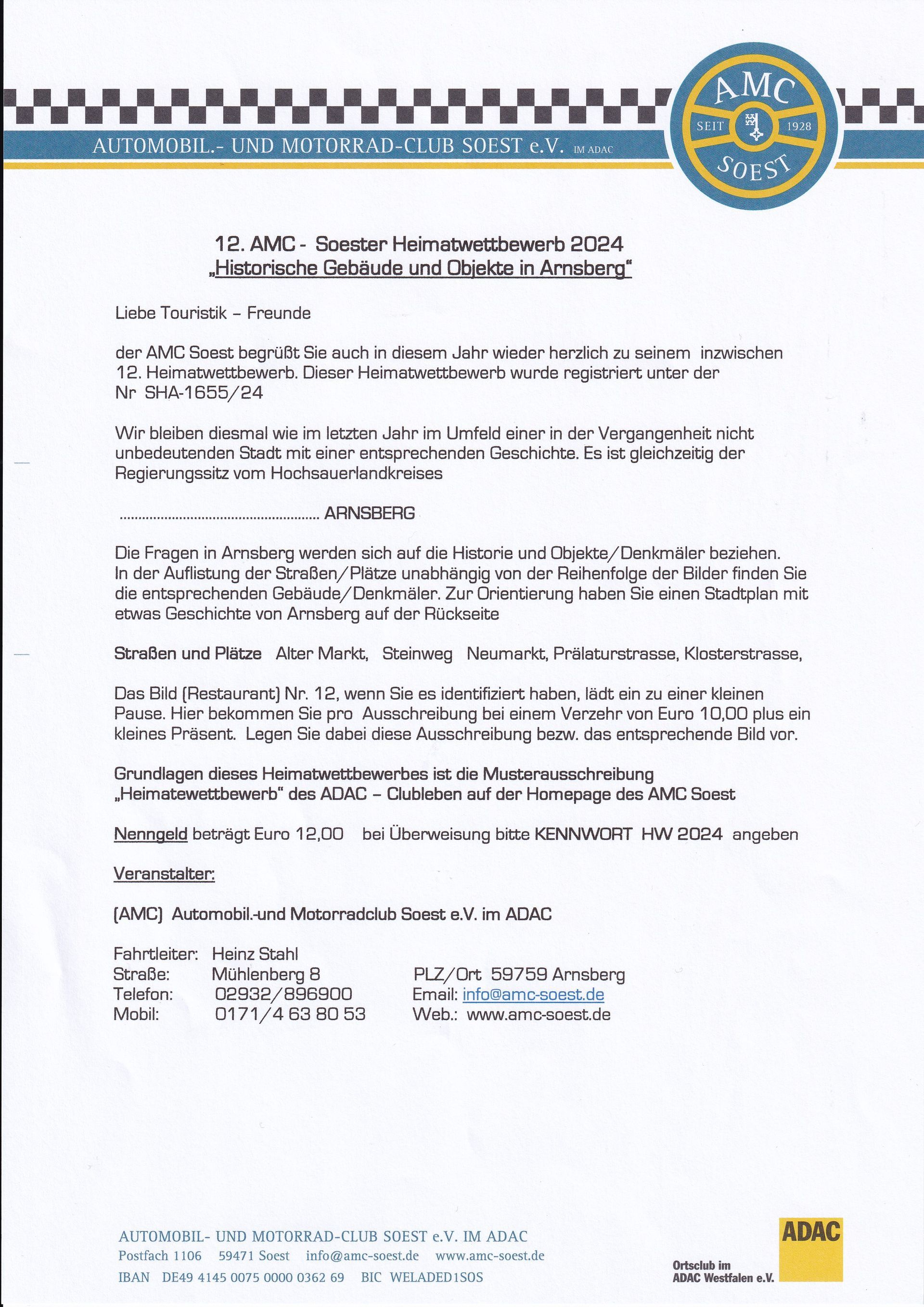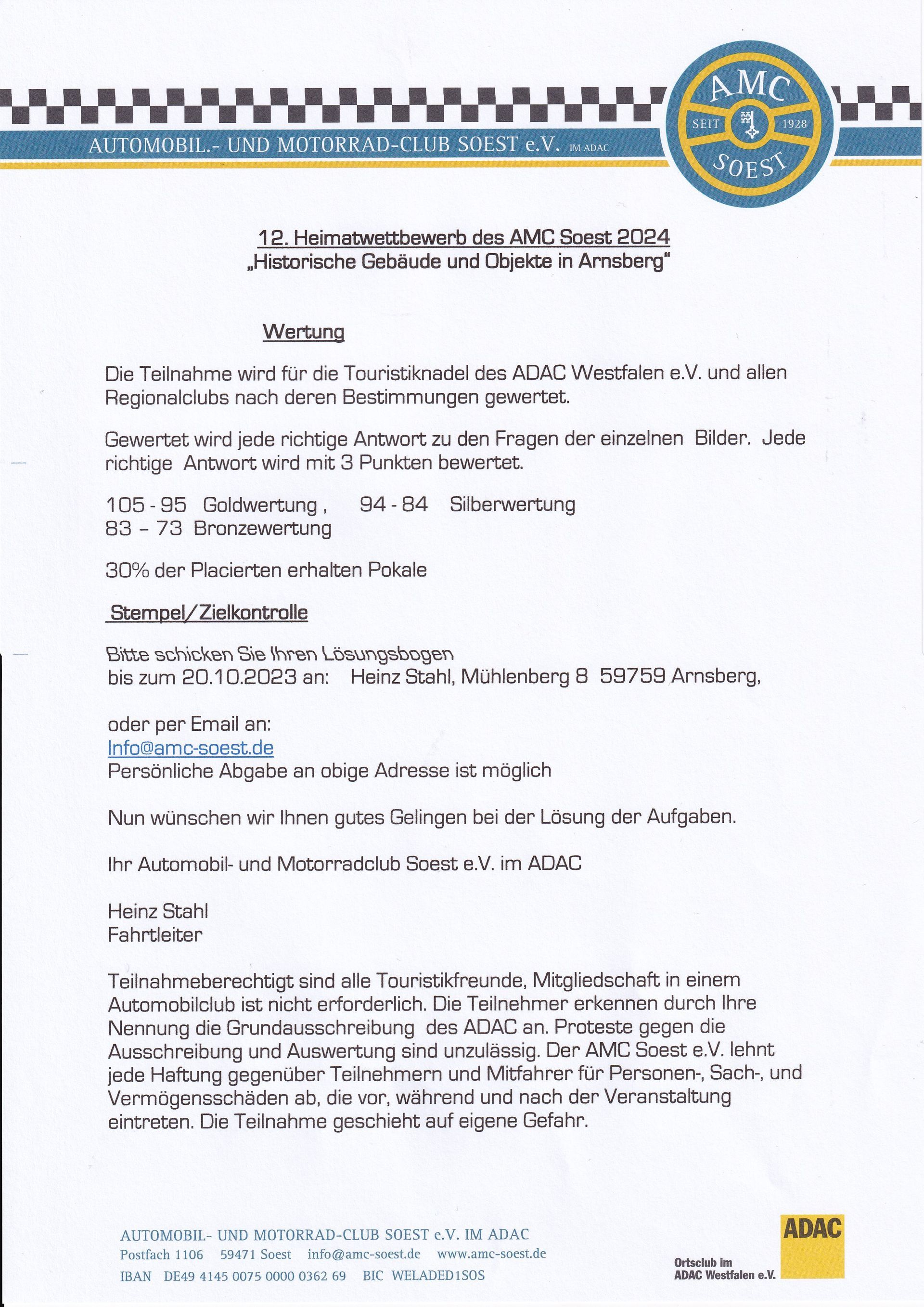 Der AMC Soest bedankt sich für Ihre Teilnahme an unserem diesjährigen Heimatwettbewerb des AMC Soest. Mit der Konzentration der Fragen auf den historisch interessanten Ort Arnsberg haben wir versucht auch etwas „nachhaltig“ zu werden. Alle Objekte/Fragen waren fußläufig zu erreichen.